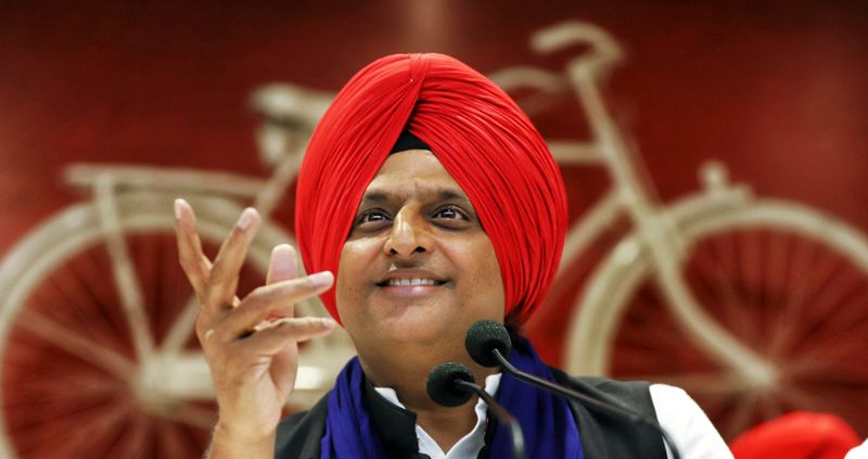 Ahead of the press conference, Yadav sat patiently as one of the Sikh delegates visiting him and tied the turban.