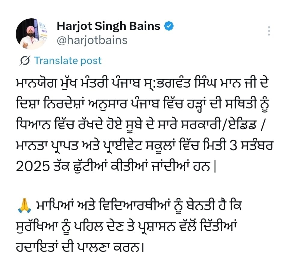 Minister Harjot Singh Bains wrote that “According to the directions of Hon’ble Chief Minister Punjab Bhagwant Singh Maan ji, in view of the flood situation in Punjab, all government/aided/recognised and private schools of the state are closed till 3rd September 2025.” Parents and students are requested to take safety measures and follow the instructions given by the administration. Interestingly, due to the floods in Punjab earlier, holidays were declared till August 31, which have now been extended.
